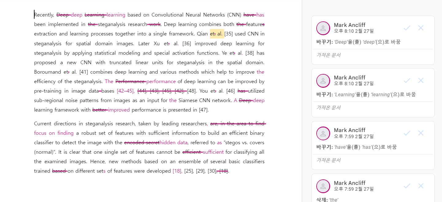 - 이해할 수 없는 문장 (e.g. 번역기 사용, 문장 자체의 품질 문제등)이 너무 많은 경우 교정이 취소될 수 있습니다.